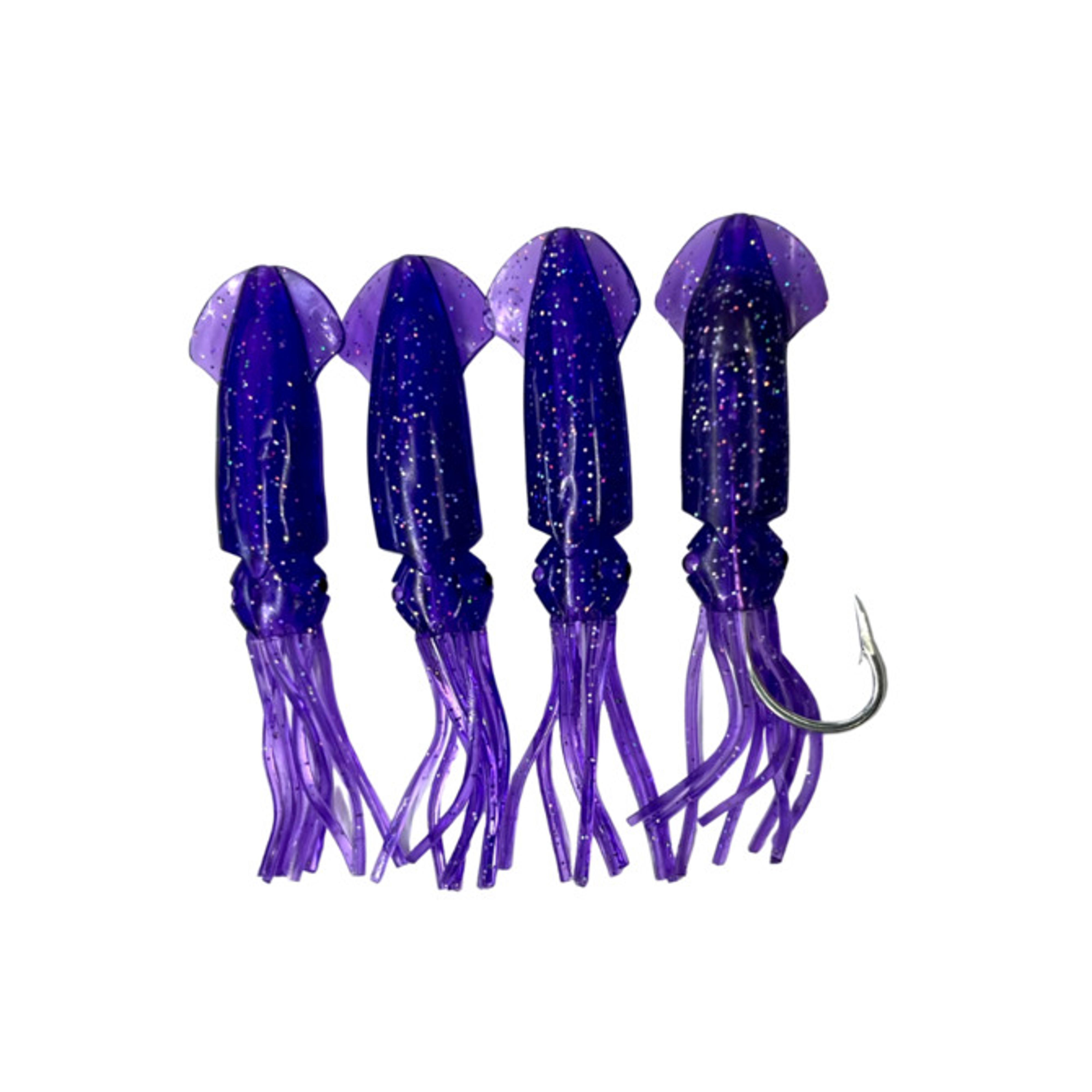 4 in-line micro rubber 4" squids rigged on 60lb fluorocarbon and 7/0 hook 7766DT.