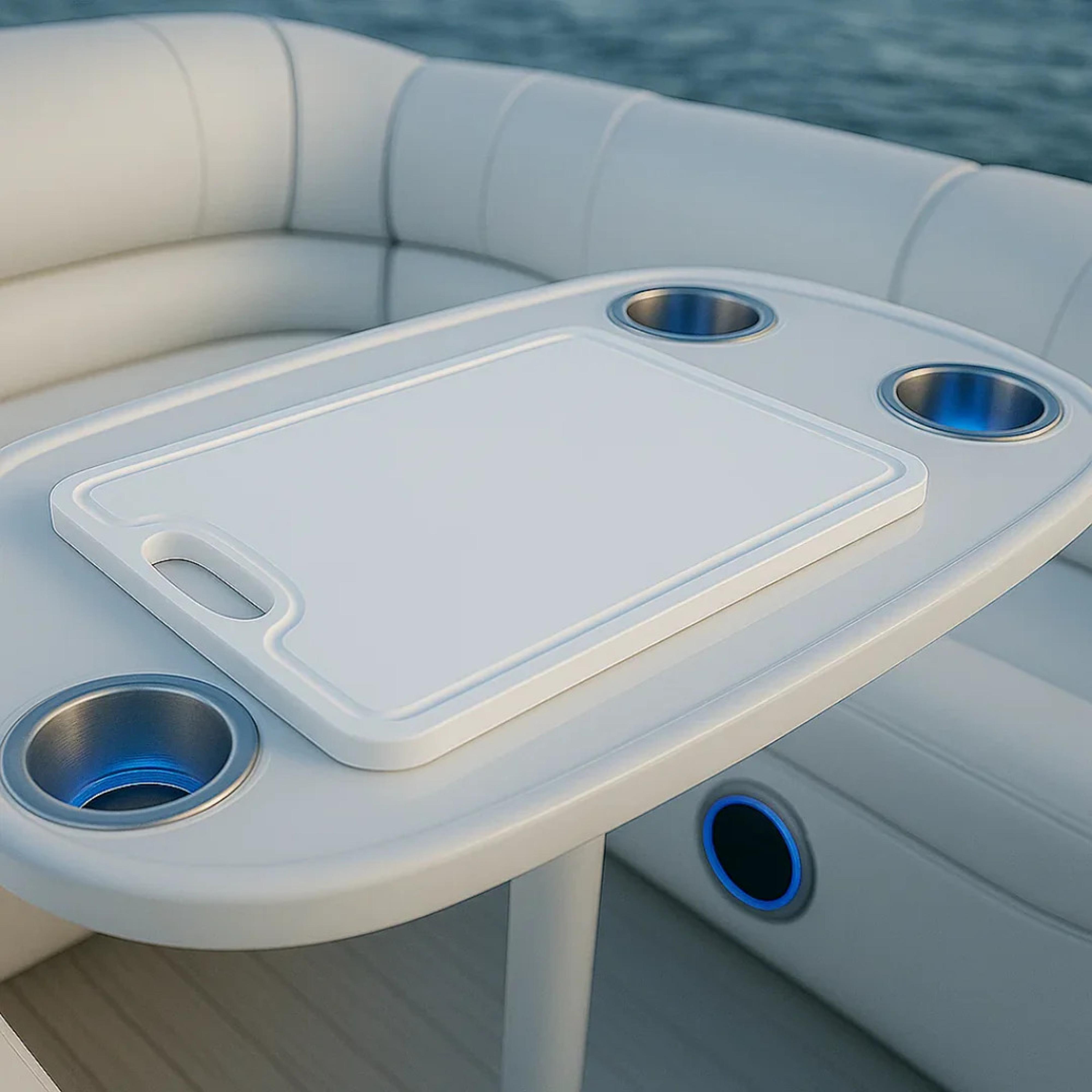The TRAPSKI Boat Board is a versatile, cutting and serving board made for life on the water and just as useful at home. With non-skid, non-mark rubber feet, it stays firmly in place on coolers, tables, gunnels, and countertops &mdash even while rolling on the boat.