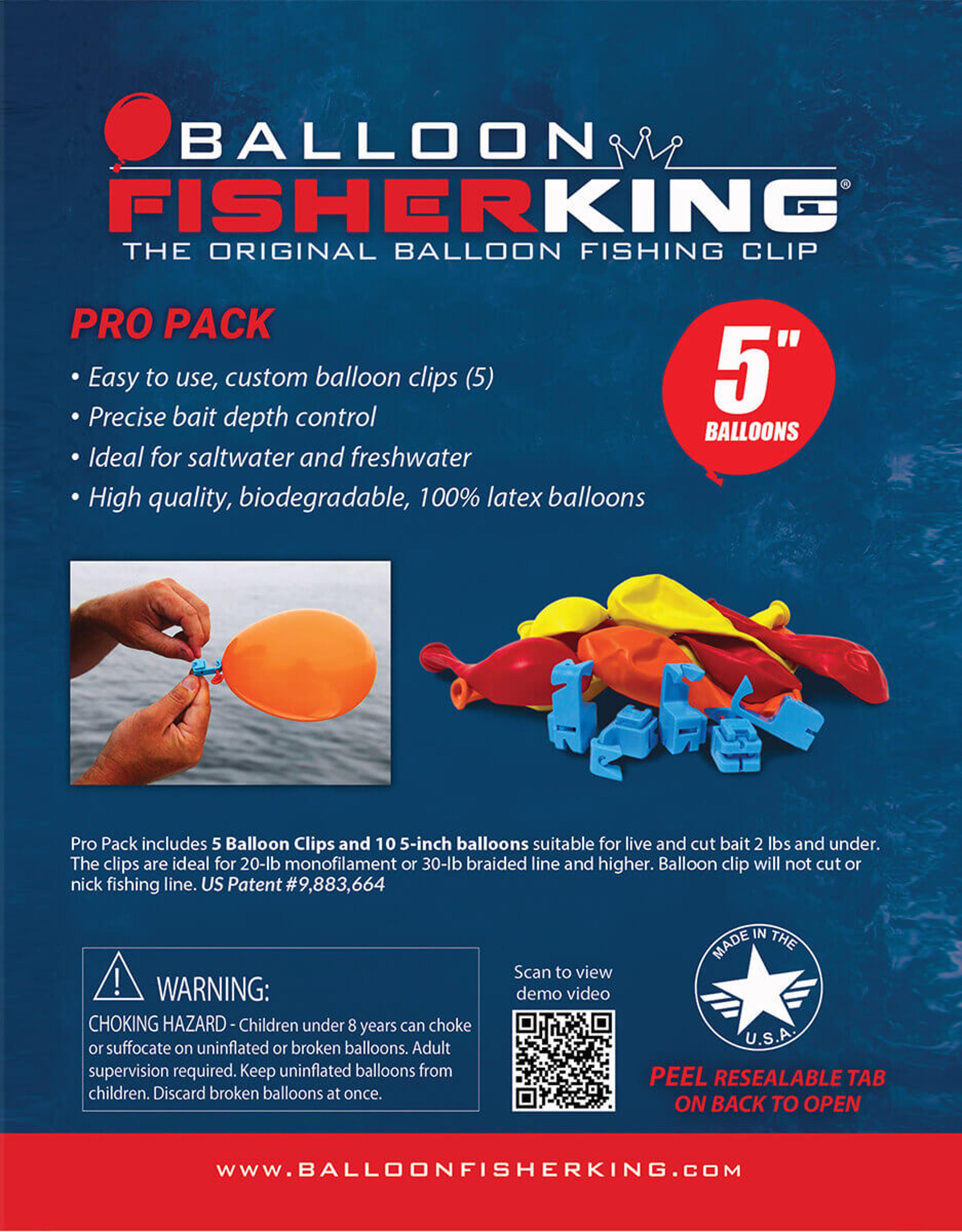 Pro Pack includes 5 Balloon Clips and 10 5-inch balloons suitable for live and cut bait 2 lbs and under. The clips are recommended for 20-lb monofilament or 30-lb braided line and higher.
